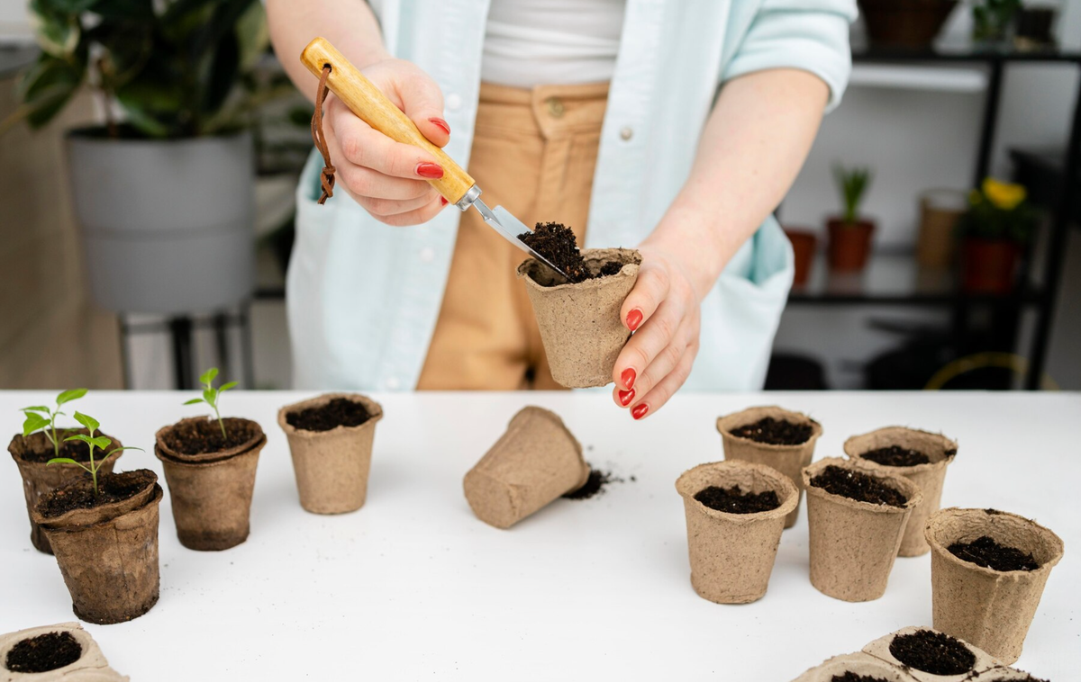 Woman using hand shovel and peat pots indoors, Freepik.